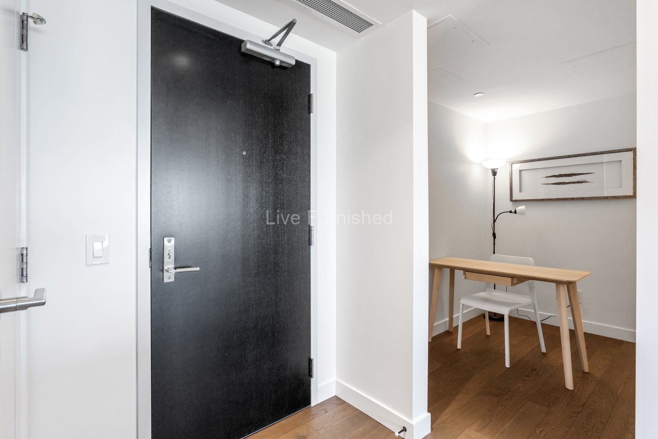 These 1-bed + den, 1-bath suites are adorned with stainless steel appliances, quartz countertops, and modern furnishings. Embrace the convenience of in-suite laundry and a 65″ smart TV. Your workspace awaits for efficient remote work. The bedrooms boasts a queen bed and ample closet space. Indulge in the spa-like bathroom with upscale fixtures and ambient lighting. Utilities are all-inclusive. The building offers 24/7 concierge, security, and a 5th-floor social space with dog run, boardroom, TVs, and BBQ-equipped terrace. Direct pedway access connects you to neighboring buildings.